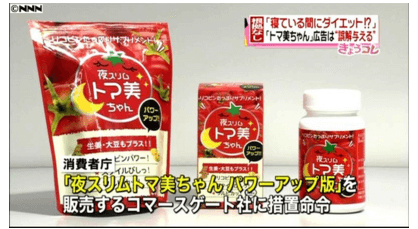 サプリメント「夜スリムトマ美ちゃん パワーアップ版」の広告などで、「寝ている間に勝手にダイエット!?」などの表示に合理的な根拠はないとして、消費者庁は販売元のコマースゲートに景品表示法に基づく措置命令を出した。